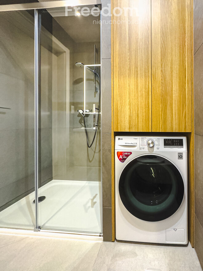 prysznic, pralkę, WC, umywalkę oraz zabudowany piecyk gazowy.